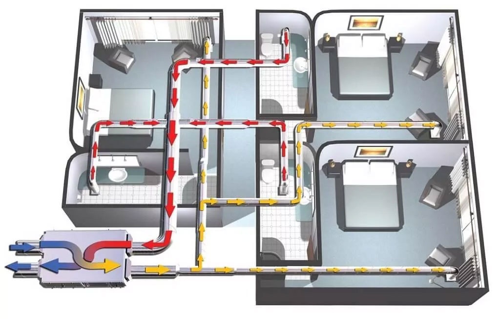 В системе приточно-вытяжной вентиляции есть два потока воздуха: приток и отток. Приток — это поступление свежего воздуха с улицы. Установка забирает свежий воздух, пропускает через воздушный фильтр, очищает, подогревает доставляет его в помещения дома.
